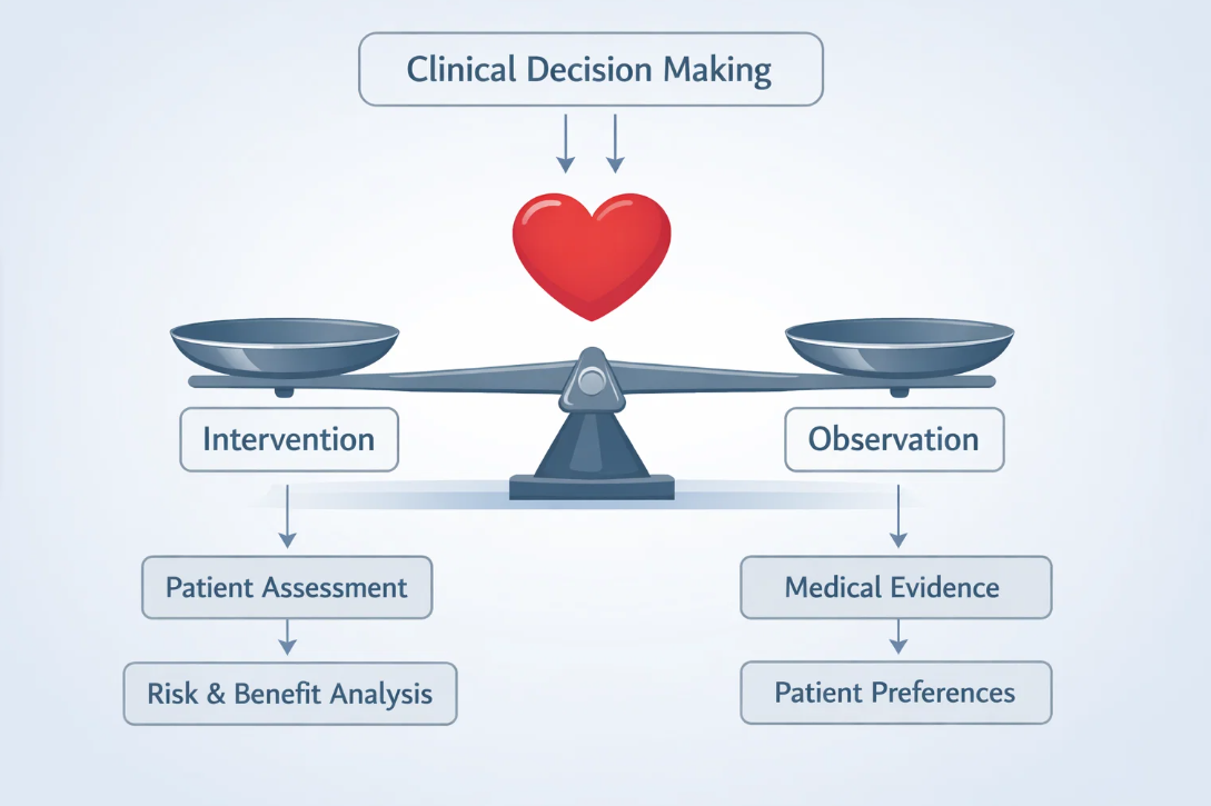 - 많은 환자가 "검사 결과가 괜찮으니 지켜보자"는 말을 방치로 오해하곤 합니다. 하지만 의학적 관점에서 관찰은 개입의 손익 계산이 끝난 결과입니다.